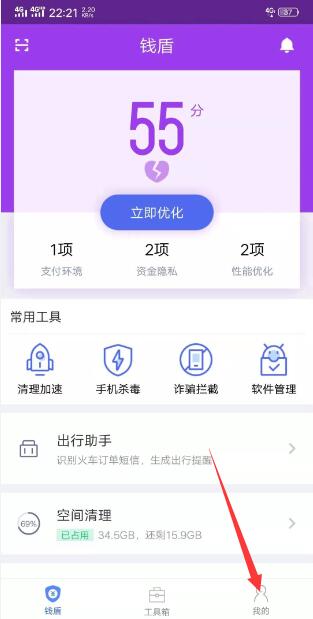3、打开钱盾app,点击最下面菜单栏 “我的” 这个选项卡切换
