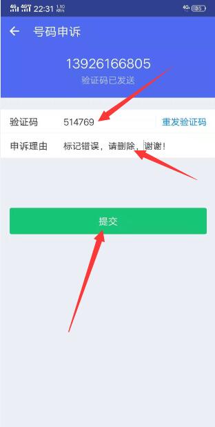 10、输入申诉号码收到钱盾过来的短信验证码及标记理由:一般可以随便写如:号码标记错误,请删除!